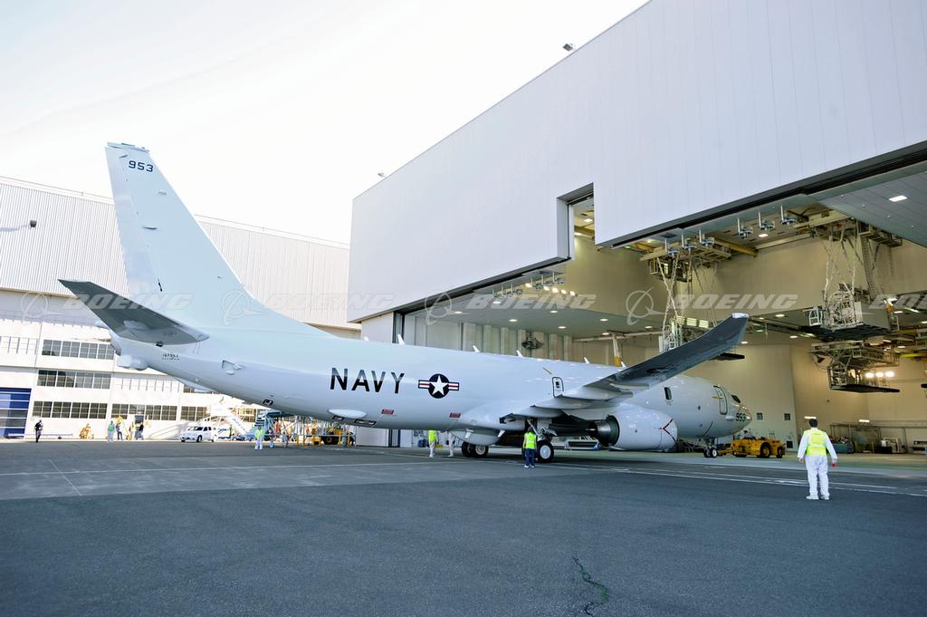 The first painted P-8A Poseidon aircraft rolls out of the paint hangar at Boeing's Renton, Washington facility in April 2009, displaying its new U.S. Navy livery. The P-8A is built by a Boeing-led industry team that includes CFM International, Northrop Grumman, Raytheon, Spirit AeroSystems and GE Aviation.
