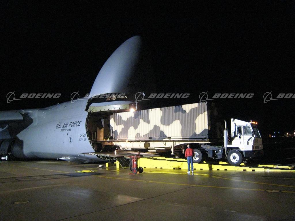 On April 19, 2009 Boeing announced that it delivered an advanced Apache Longbow Crew Trainer (LCT) to the U.S. Army in Illesheim, Germany, in April 2009 and declared the helicopter simulator “ready for training.” In this photo, the LCT is loaded onto a C-5A aircraft at Fort Campbell, Ky.
