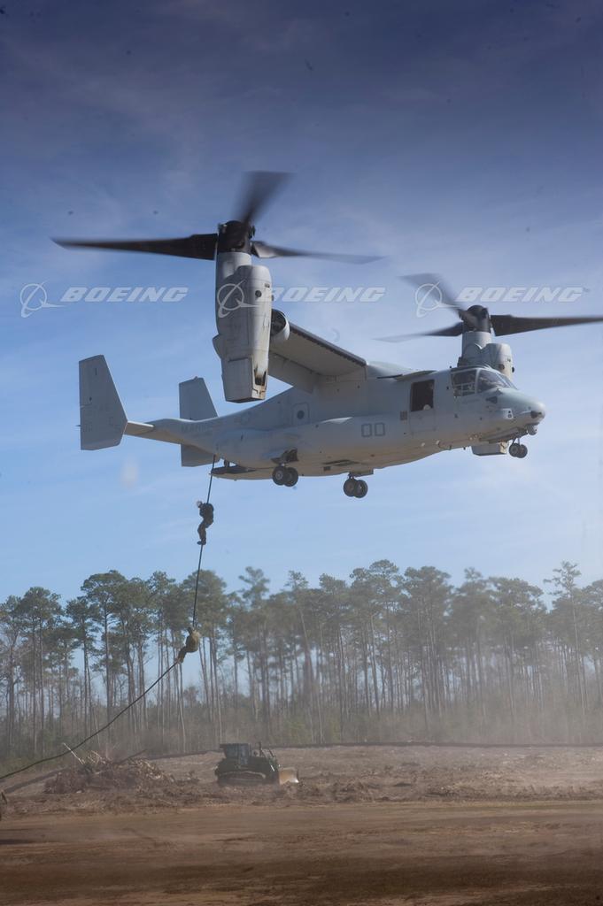 With the V-22 engine nacelles and rotors in vertical position, it can take off, land and hover like a helicopter. The V-22 Osprey can carry 24 combat troops, or up to 20,000 pounds of internal cargo or 15,000 pounds of external cargo, at twice the speed of a helicopter.