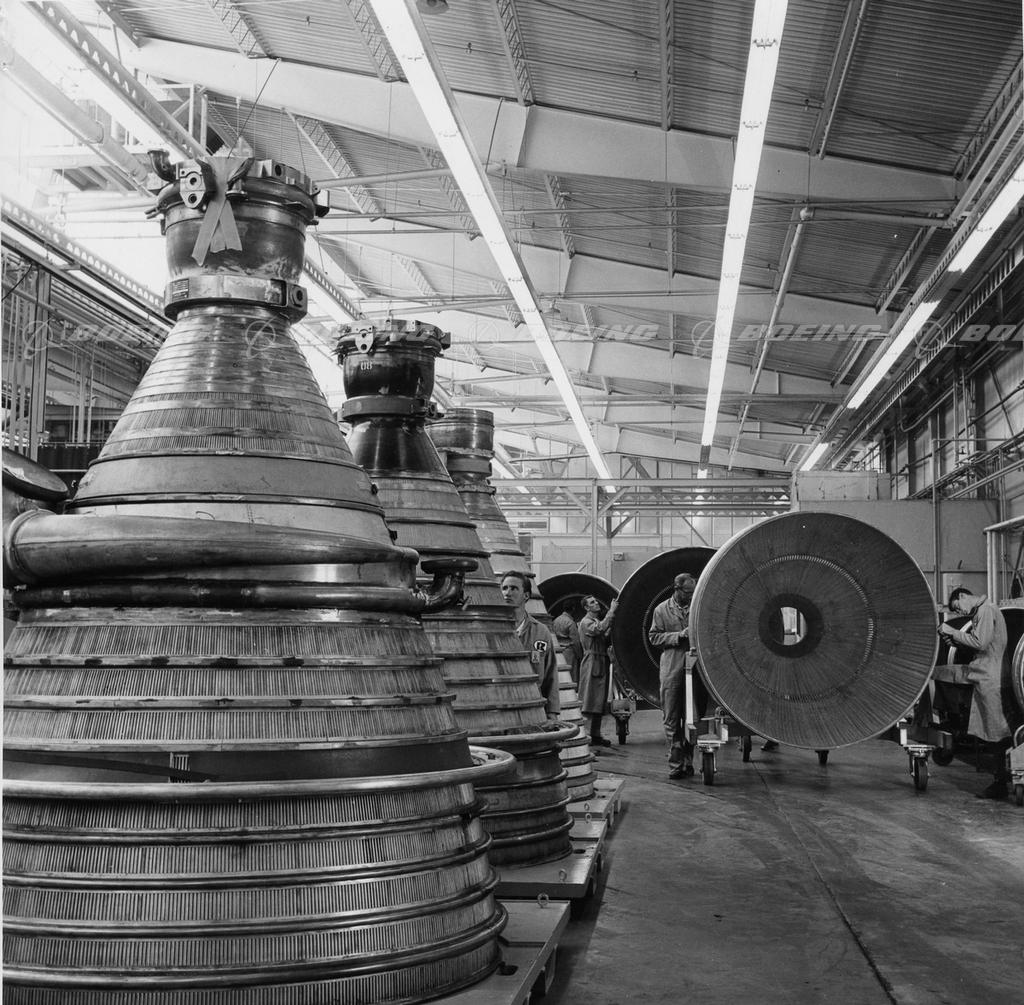 January 18, 1966 Press Release: This is the production line for thrust chambers of hydrogen-fuled J-2 rocket engine that will launch first orbital flights of three astronauts in Apollo spacecraft, later will fly the spacecraft on its journey to the moon. J-2 develops 200,000 pounds of thrust. It is being produced at Canoga, Calif. plant of Rocketdyne, a division of North American Aviation, Inc., for NASA's Marshall Space flight Center. A single J-2 will power the S-IVB stage being built by Douglas Aircraft Company for the second stage of the Saturn IB vehicle and the third stage of Saturn V. Five J-2's will be used to produce 1,000,000 pounds of thrust in the S-II stage being built by North American's Space and Information systems Division for the second stage of the Saturn V moon-launch vehicle.