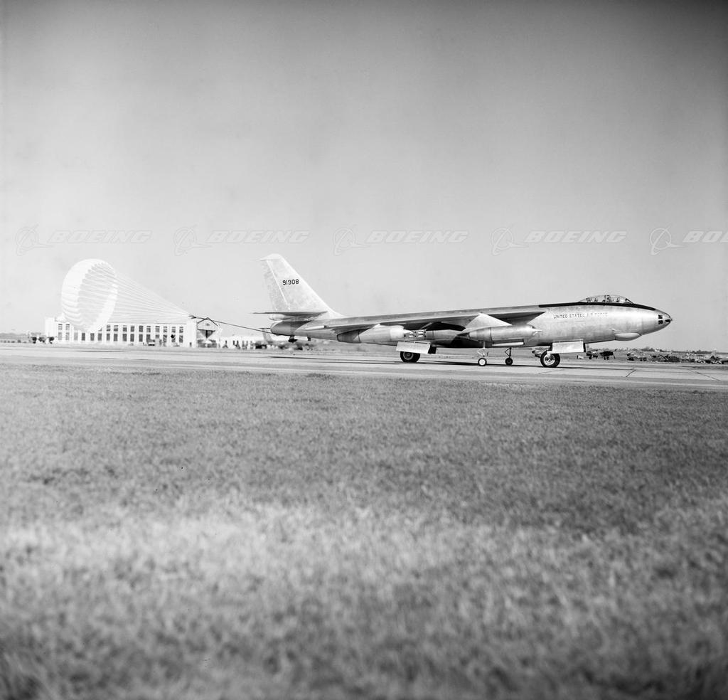 The Boeing B-47 was the country's first swept-wing multi-engine bomber. It represented a milestone in aviation history and a revolution in aircraft design. Every large jet aircraft today is a descendant of the B-47. Because early jet engines could not provide enough thrust for takeoff, the prototype XB-47 had 18 small rocket units in the fuselage for jet-assisted takeoff (JATO). Thrust reversers and anti-skid brakes had not yet been developed, so a ribbon-type drag parachute reduced the B-47 landing speed.