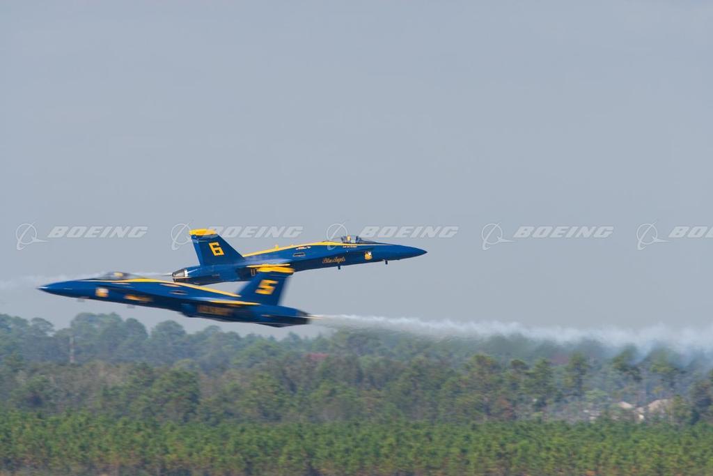 The Blue Angels, the U.S. Navy's flight demonstration team, perform an air show at their home base, Naval Air Station Pensacola, Fla. The Blue Angels fly the Boeing-built F/A-18A/B Hornet.