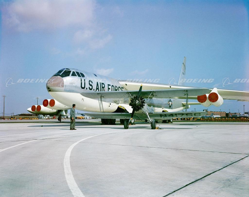 By the 21st century, the Boeing B-52 was in its fifth decade of operational service. The eight-engine, 390,000-pound jet was the country's first long-range, swept-wing heavy bomber. It began as an intercontinental, high-altitude nuclear bomber, and its operational capabilities were adapted to meet changing defense needs. Production versions of the B-52A were B-52Bs, with more weight and larger engines. Some had photographic reconnaissance or electronic capsules in their bomb bays and were redesignated RB-52Bs. The B-52s increased in range, power and capability with each variant. The B-52H made its first flight March 6, 1961, and is still in service. In all, 744 B-52s were produced by Seattle, Wash., and Wichita, Kan., plants between 1952 and 1962.