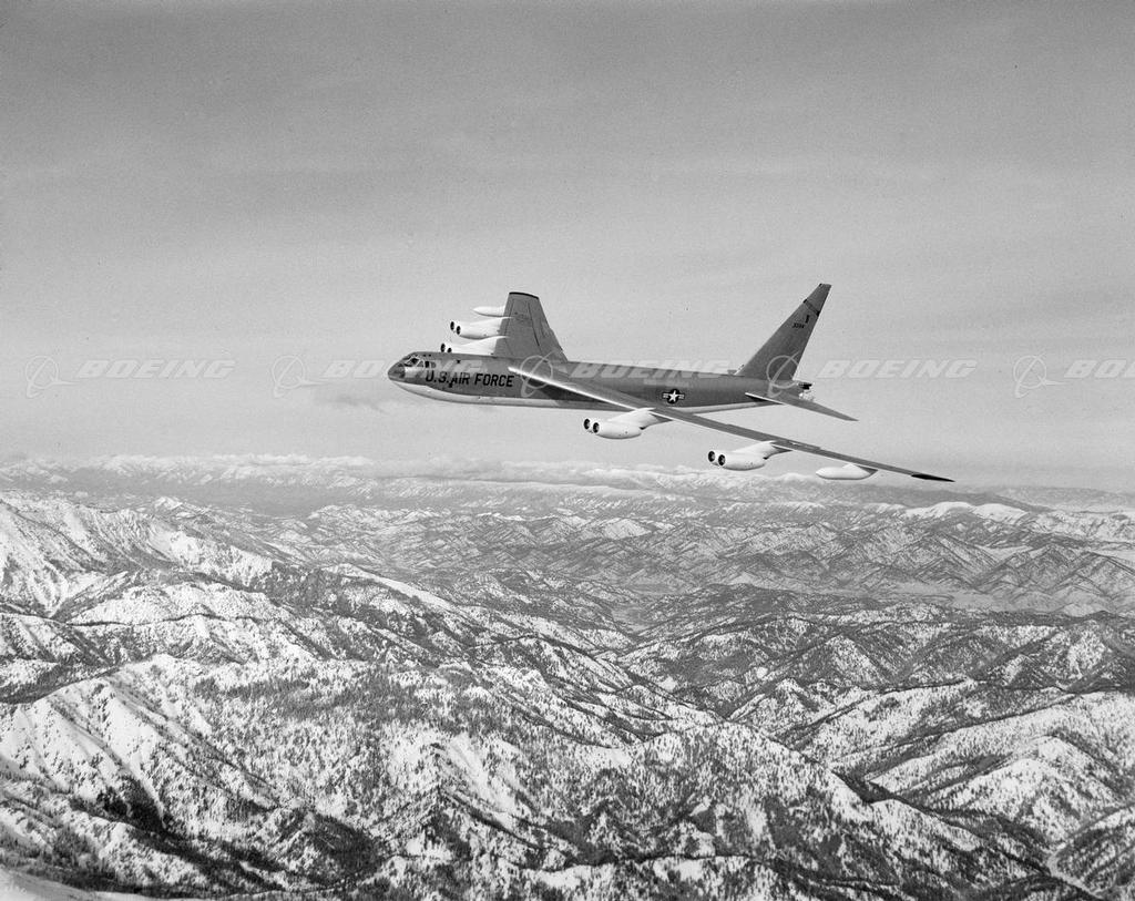 By the 21st century, the Boeing B-52 was in its fifth decade of operational service. The eight-engine, 390,000-pound jet was the country's first long-range, swept-wing heavy bomber. It began as an intercontinental, high-altitude nuclear bomber, and its operational capabilities were adapted to meet changing defense needs. Production versions of the B-52A were B-52Bs, with more weight and larger engines. Some had photographic reconnaissance or electronic capsules in their bomb bays and were redesignated RB-52Bs. The B-52s increased in range, power and capability with each variant. The B-52H made its first flight March 6, 1961, and is still in service. In all, 744 B-52s were produced by Seattle, Wash., and Wichita, Kan., plants between 1952 and 1962.