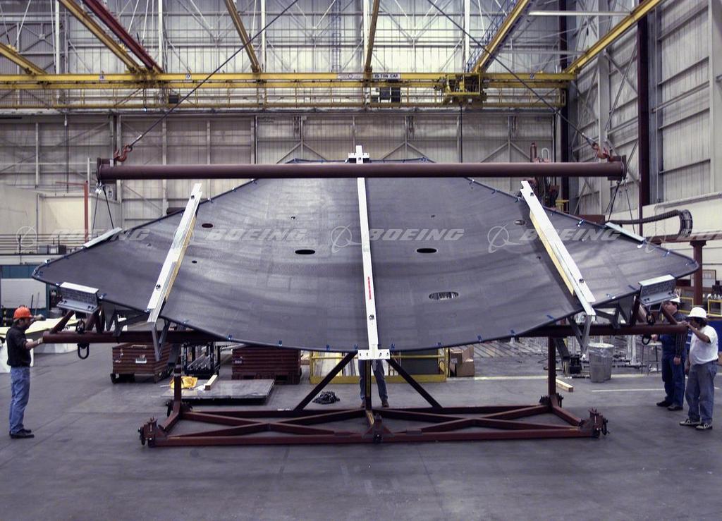 SEATTLE, Nov. 4, 1998 — Shown here, Boeing employees in Seattle help guide the wing skin as it is positioned for shipment to Palmdale. The skin, measuring nearly 29 feet across and weighing 742 pounds, is part of a single-unit composite wing module that sits atop the Joint Strike Fighter fuselage.