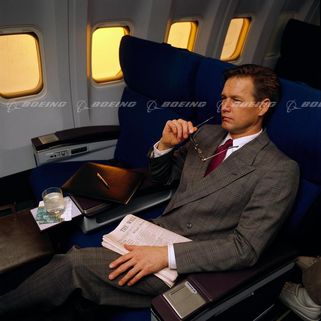 A businessman relaxes in the business class section of the 767-300. The six-abreast seating in business class on 767s is popular because every passenger has either a window or an aisle seat. Seating in this section is typically set at a 38 inch pitch.