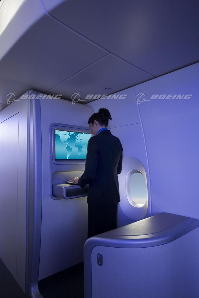 The 747-8 applies interior features from the 787 Dreamliner that includes a new curved, upswept architecture giving passengers a greater feeling of space and comfort, while adding more room for personal belongings. The interior architecture is accentuated by new lighting technology that creates a perception of airy brightness and provides smooth lighting transitions to offer a more restful environment. A 1,750-square-foot (533-square-meter) sales display of the new interior is located at the Boeing Customer Experience Center in Renton, WA.