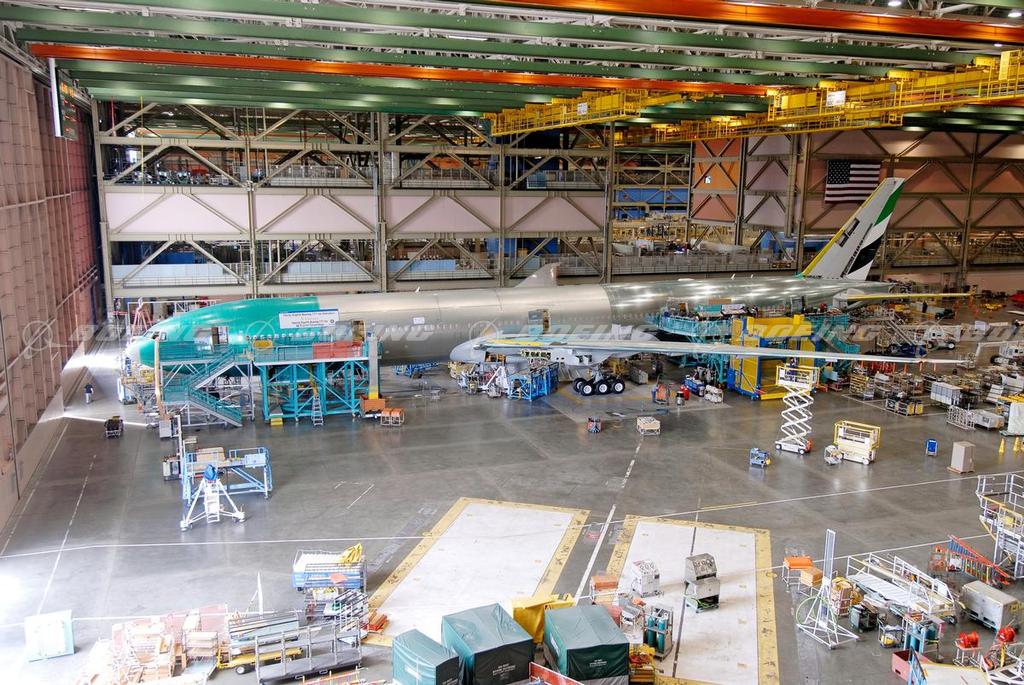 On Nov. 8, 2006 The Boeing Company began using a moving assembly line for the first time to build its market-leading 777 jetliner. To make its 777 assembly line move during final assembly, Boeing uses a tug that attaches around the front landing gear of the airplane and pulls it forward. The tug has an optical sensor that follows a white line along the floor. During final assembly, mechanics install items such as seats, overhead stow bins and other items on the interior of the airplane. In addition, functional testing is performed on the various systems in the airplane and the engines are attached.