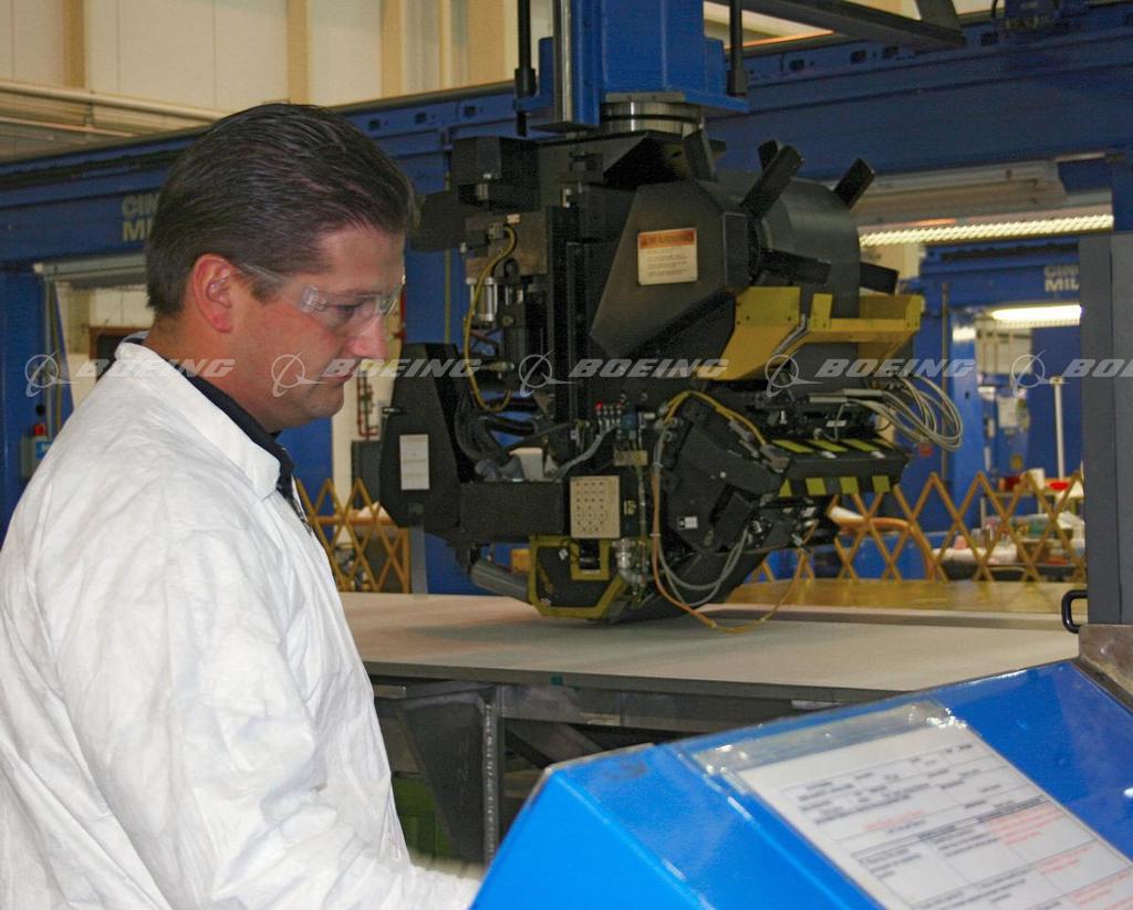 Fabrication of the first composite stringers for the vertical fin on the 787 Dreamliner, Boeing's all new commercial airplane, began Sept. 13, 2006 at the Composite Manufacturing Center (CMC) at Boeing Frederickson in Pierce County, Wash. The vertical fin is the largest major Boeing 787 Dreamliner assembly built by an internal Boeing supplier. CMC plans to deliver its first fully functional vertical fin to 787 Final Assembly in Everett, Wash., in Spring 2007. Fabrication start of the 787 vertical fin began with the push of a button by Boeing CMC employee, Don Hall, flat tape laminating machine operator. The process involves laying down composite tape to build up a charge, with the part then formed on a tool and cured in a large autoclave prior to assembly.