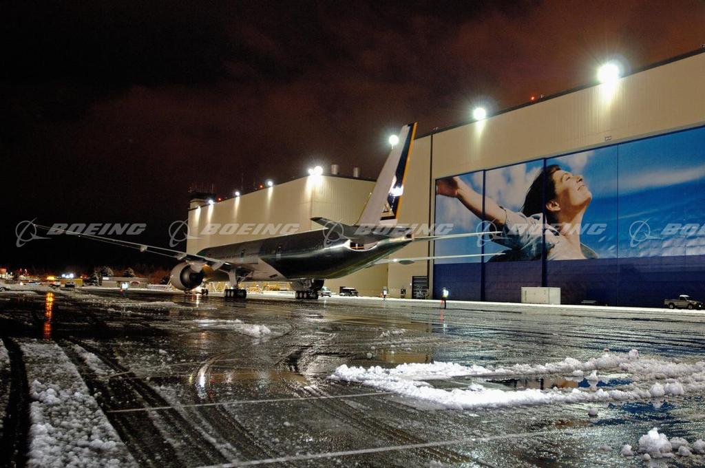 A 777 is towed out of the Everett Main Assembly Building to the Paint Hangar.