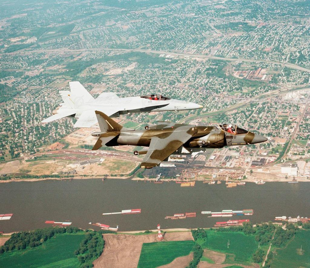 AV-8B Harrier II in Flight with F/A-18 Hornet Above St. Louis, MO