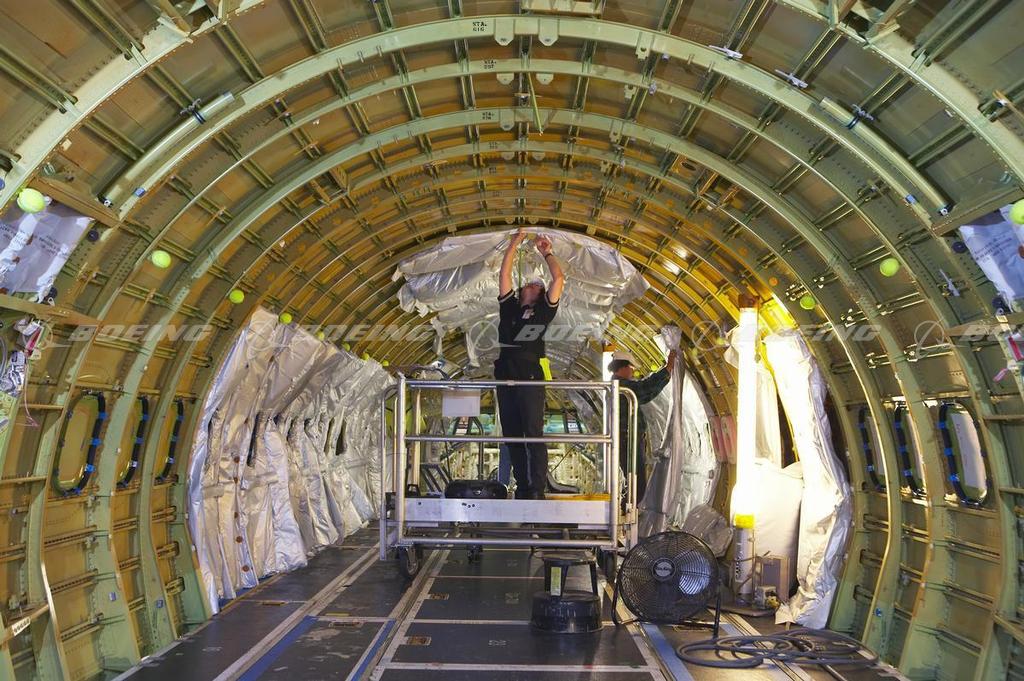 Factory Workers Installing Insullation on a 737 Fuselage