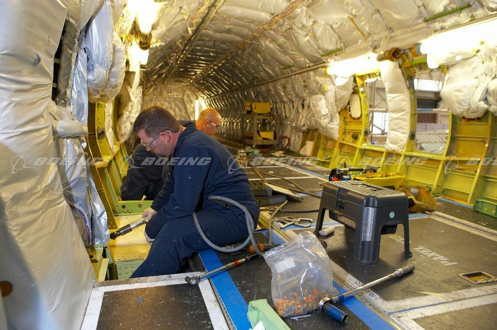 Factory Worker Drilling Floor Panels Inside a 737 Fuselage