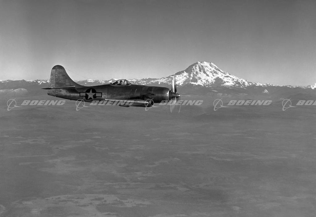 The XF8B-1 fighter-bomber was the heaviest carrier-based airplane built before the end of World War II. It was the first fighter Boeing built after the P-26 Peashooter of 1936 and the last before the F/A-22 in 1990. The XF8B-1 could be flown as a torpedo bomber and, because of its single-seat configuration, could also be used as a fighter. Because of its size and great horsepower, the XF8B-1 used an unusual dual six-blade contrarotating propeller. It carried bombs internally and extra fuel externally, and its six machine guns were mounted inside the folding wings.