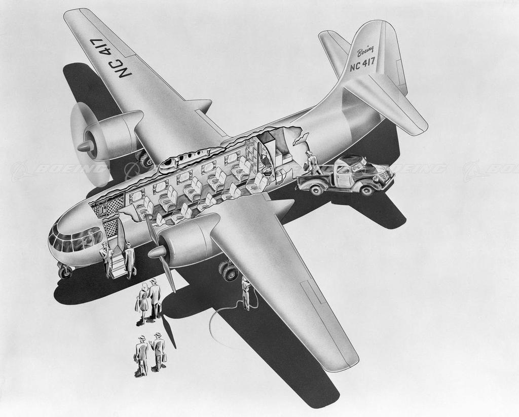 The Model 417 local service transport was ordered into quantity production at Boeing Wichita in 1946. This cutaway drawing of the two-engine, high-wing plane with tricycle landing gear, shows the basic arrangement whereby it was to have accommodated 20 passengers with a large cargo compartment at the rear and a smaller cargo compartment and hand luggage spaces at the front. The Model 417 was to have been offered with alternate interiors. However, the program was cancelled before production could get off the ground.