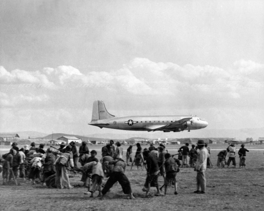 Taking off from the WWII airfield at Kumming, China, a U.S. Army Air Force/Douglas Aircraft Company C-54 Skymaster returns to its base in India.