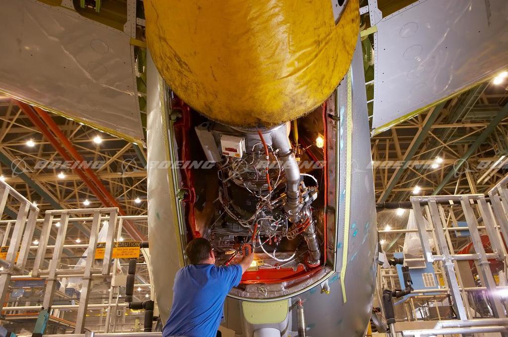 Factory Worker Under the Tail of a 737 in Renton, WA
