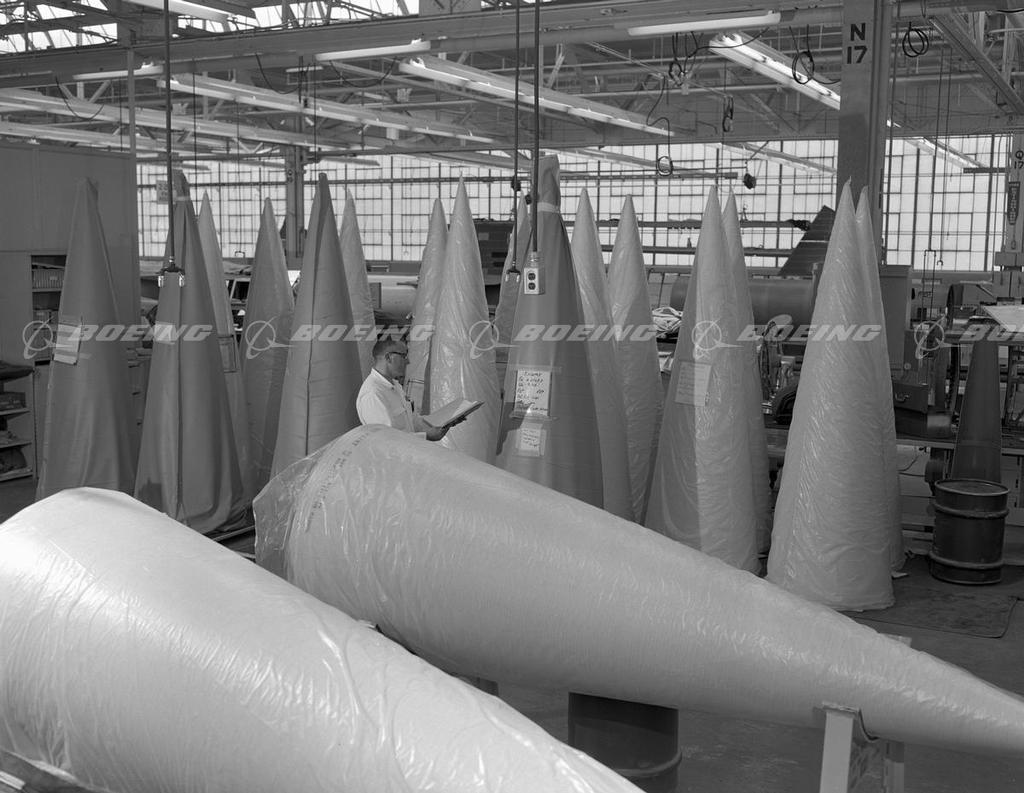 Orange and White Bomarc Slipcover Demonstrated by Boeing Employee