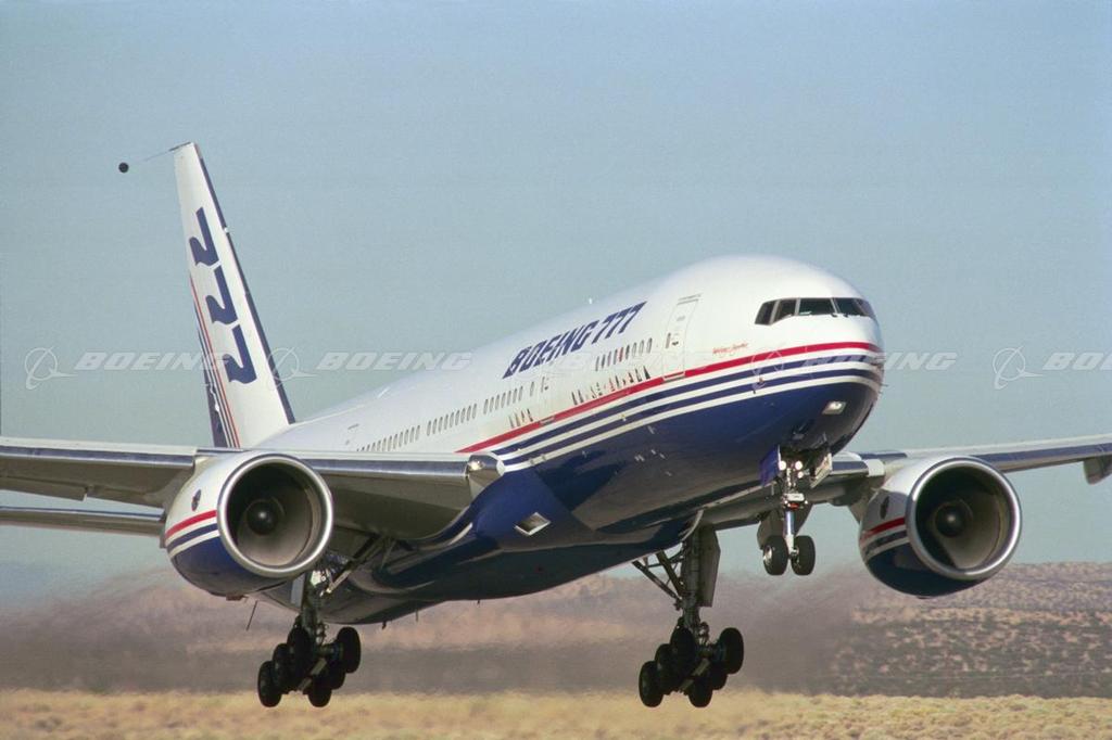 Takeoff from Edwards Air Force Base, California. The 777-200 longer-range jetliner can fly 8,860 nautical miles, making it the longest range airplane in the world. It can connect cities as far apart as Singapore and New York or Atlanta and Hong Kong. The 777 wing uses the most aerodynamically efficient airfoil ever developed for subsonic commercial aviation. This advanced wing enhances the airplane's ability to climb quickly and cruise at higher altitudes than competing airplanes while achieving higher cruise speeds. It also allows the airplane to carry full passenger payloads out of many high-elevation, high-temperature airfields.