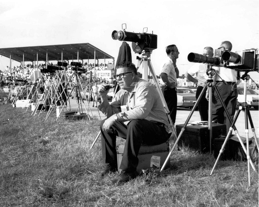 Boeing photographer Vern Manion rests in front of a row of cameras shortly before the Apollo 11 launch.