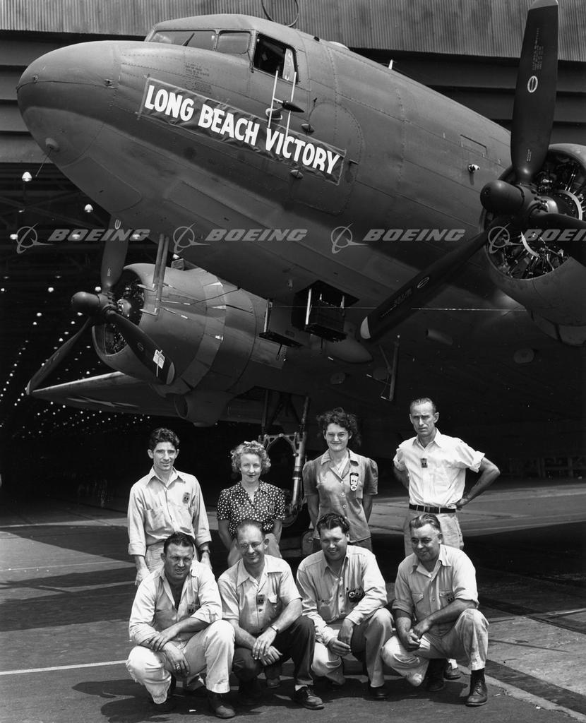 DAC workers pose by the last C-47 Skytrain produced in the Long Beach plant on August 29, 1944. Every branch of the U.S military and all major allied powers flew the C-47. The U.S. Navy version was the R4D. The British and the Australians designated it the Dakota (DACoTA for Douglas Aircraft Company Transport Aircraft). General Dwight D. Eisenhower, Supreme Commander of Allied Forces in Europe, termed the C-47 one of the most vital pieces of military equipment used in winning World War II. C-47s remained in active military service long after the end of World War II. They played a critical role in the 1948 Berlin Airlift and saw action in the Korean and Vietnam wars.