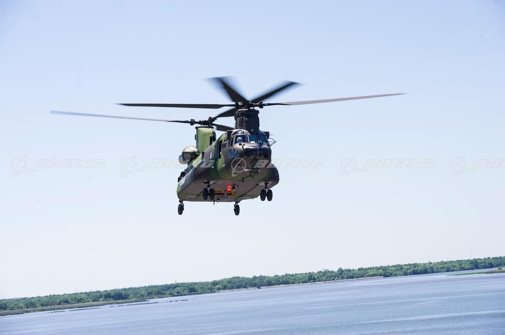 The first of 15 new CH-147F Chinook helicopters makes its final test flight on June 21, 2013 at Boeing’s Ridley Township plant. The Canadian H-47 Chinook, designated CH-147F by the Canadian Forces, provides advanced features that include a newly designed, modernized airframe with a long-range fuel system, upgraded electrical system, and enhanced fully integrated Common Avionics Architecture System cockpit and Digital Automatic flight Control System. The aircraft also has improved survivability features, including a Directional Infrared Countermeasures system, internal ballistic protection, and crashworthy, armored pilot and co-pilot seats.