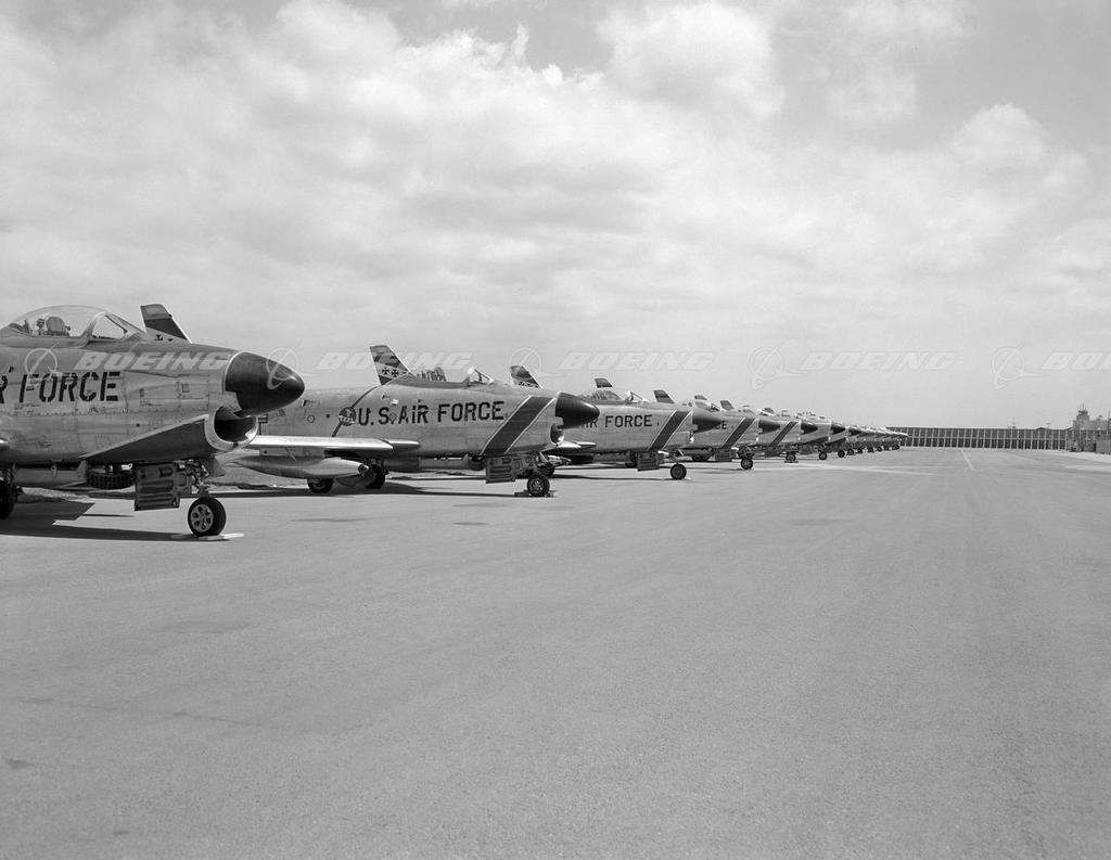 The North American F-86 Sabre Jet made its first flight Oct. 1, 1947, and was America’s first single-seat, swept-wing jet fighter. In 1948, it set a new world speed record of 671 mph, and it was the world’s first-line fighter for more than a decade after it was designed. More than 6,000 Sabre Jets were built worldwide. During the Korean conflict, the Sabre Jet flew 82,177 sorties during 32 months of combat and troop support. Four models of the craft (F-86A, E, F and H) were day fighters or fighter bombers, while the F-86D, K and L versions were all-weather interceptors and sported black radome noses, replacing the yawning jet intakes of the other models. The version built for the U.S. Navy and Marine Corps was called the FJ-2 Fury.