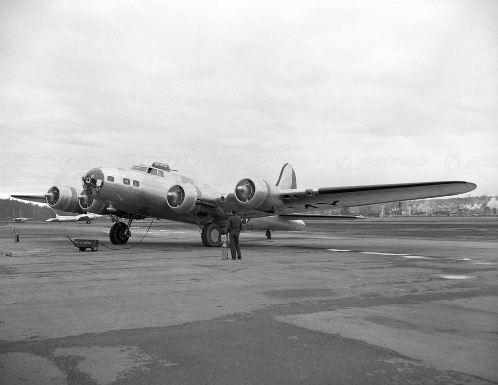 In response for the Army’s request for a large, multiengine bomber, the B-17 (Model 299) prototype, financed entirely by Boeing, went from design board to flight test in less than 12 months. The B-17 was a low-wing monoplane that combined aerodynamic features of the XB-17 giant bomber, still in the design stage, and the Model 247 transport. The B-17 was the first Boeing military aircraft with a flight deck instead of an open cockpit and was armed with bombs and five .30-caliber machine guns mounted in clear blisters. The B-17E, the first mass-produced model Flying Fortress, carried nine machine guns and a 4,000-pound bomb load. It was several tons heavier than the prototypes and bristled with armament. It was the first Boeing airplane with the distinctive - and enormous - tail for improved control and stability during high-altitude bombing. Each version was more heavily armed. In the Pacific, the planes earned a deadly reputation with the Japanese, who dubbed them four-engine fighters. The Fortresses were also legendary for their ability to stay in the air after taking brutal poundings. They sometimes limped back to their bases with large chunks of the fuselage shot off.