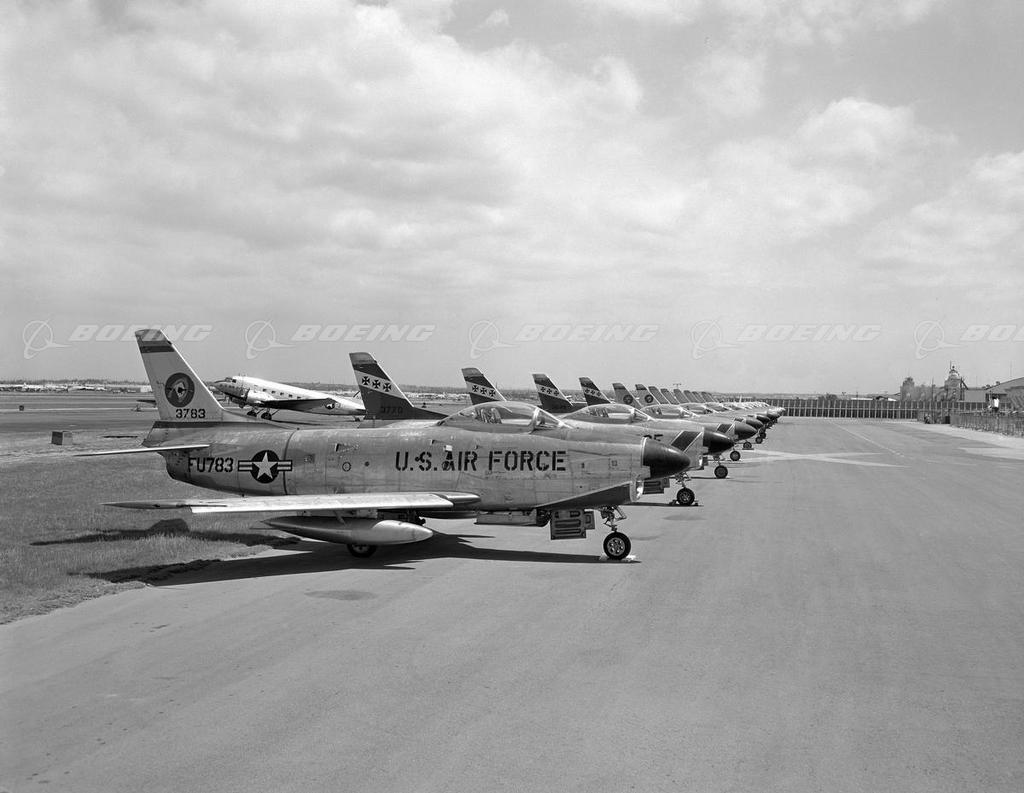 The North American F-86 Sabre Jet made its first flight Oct. 1, 1947, and was America’s first single-seat, swept-wing jet fighter. In 1948, it set a new world speed record of 671 mph, and it was the world’s first-line fighter for more than a decade after it was designed. More than 6,000 Sabre Jets were built worldwide. During the Korean conflict, the Sabre Jet flew 82,177 sorties during 32 months of combat and troop support. Four models of the craft (F-86A, E, F and H) were day fighters or fighter bombers, while the F-86D, K and L versions were all-weather interceptors and sported black radome noses, replacing the yawning jet intakes of the other models. The version built for the U.S. Navy and Marine Corps was called the FJ-2 Fury.