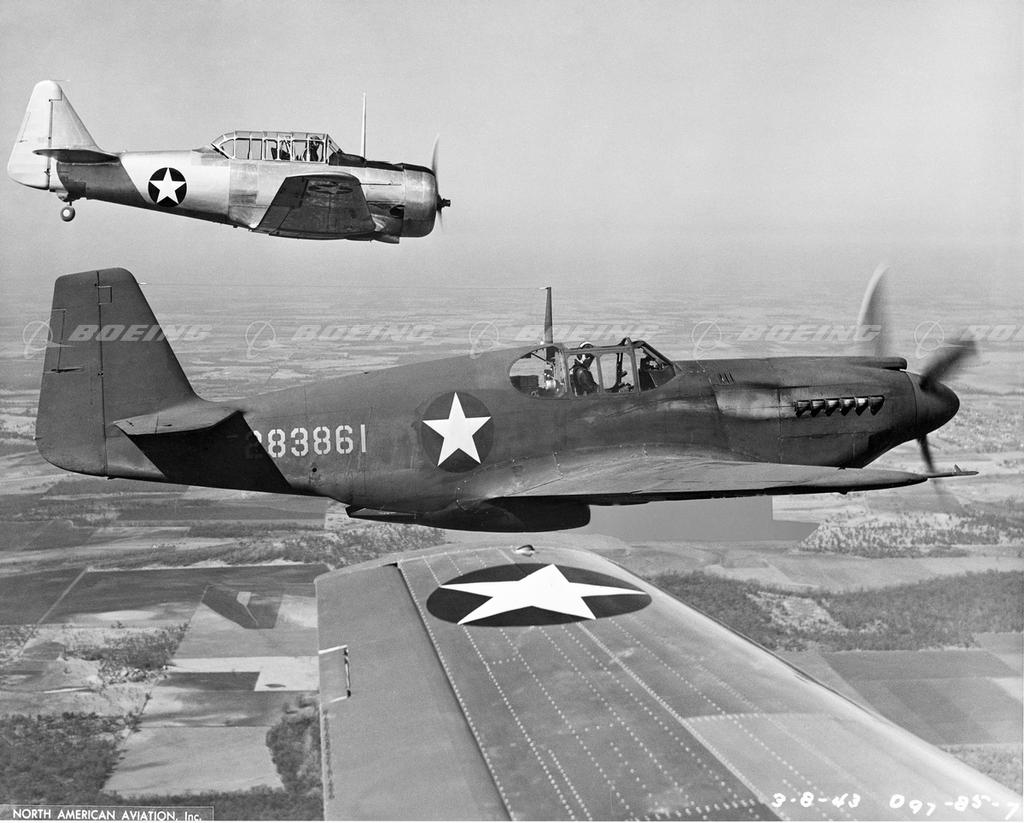 A-36 Invader (P-51 Mustang) in Flight, AT-6 Texan in Background