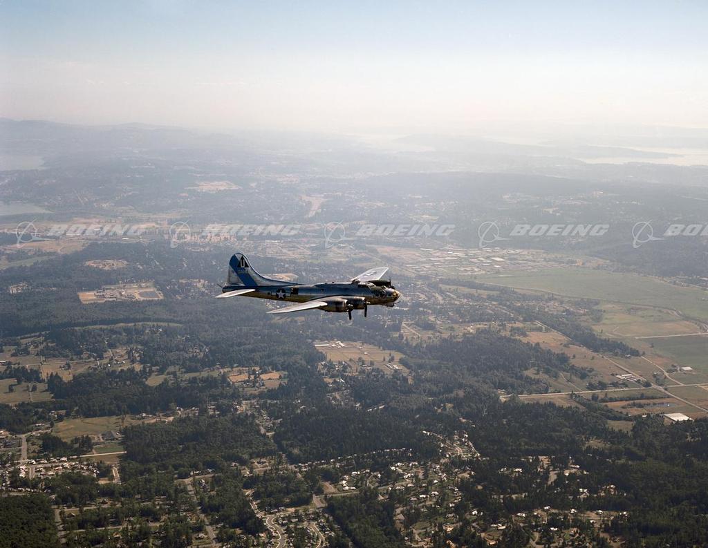 In response for the Army’s request for a large, multiengine bomber, the B-17 (Model 299) prototype, financed entirely by Boeing, went from design board to flight test in less than 12 months. The B-17 was a low-wing monoplane that combined aerodynamic features of the XB-17 giant bomber, still in the design stage, and the Model 247 transport. The B-17 was the first Boeing military aircraft with a flight deck instead of an open cockpit and was armed with bombs and five .30-caliber machine guns mounted in clear blisters. The B-17E, the first mass-produced model Flying Fortress, carried nine machine guns and a 4,000-pound bomb load. It was several tons heavier than the prototypes and bristled with armament. It was the first Boeing airplane with the distinctive - and enormous - tail for improved control and stability during high-altitude bombing. Each version was more heavily armed. In the Pacific, the planes earned a deadly reputation with the Japanese, who dubbed them four-engine fighters. The Fortresses were also legendary for their ability to stay in the air after taking brutal poundings. They sometimes limped back to their bases with large chunks of the fuselage shot off.