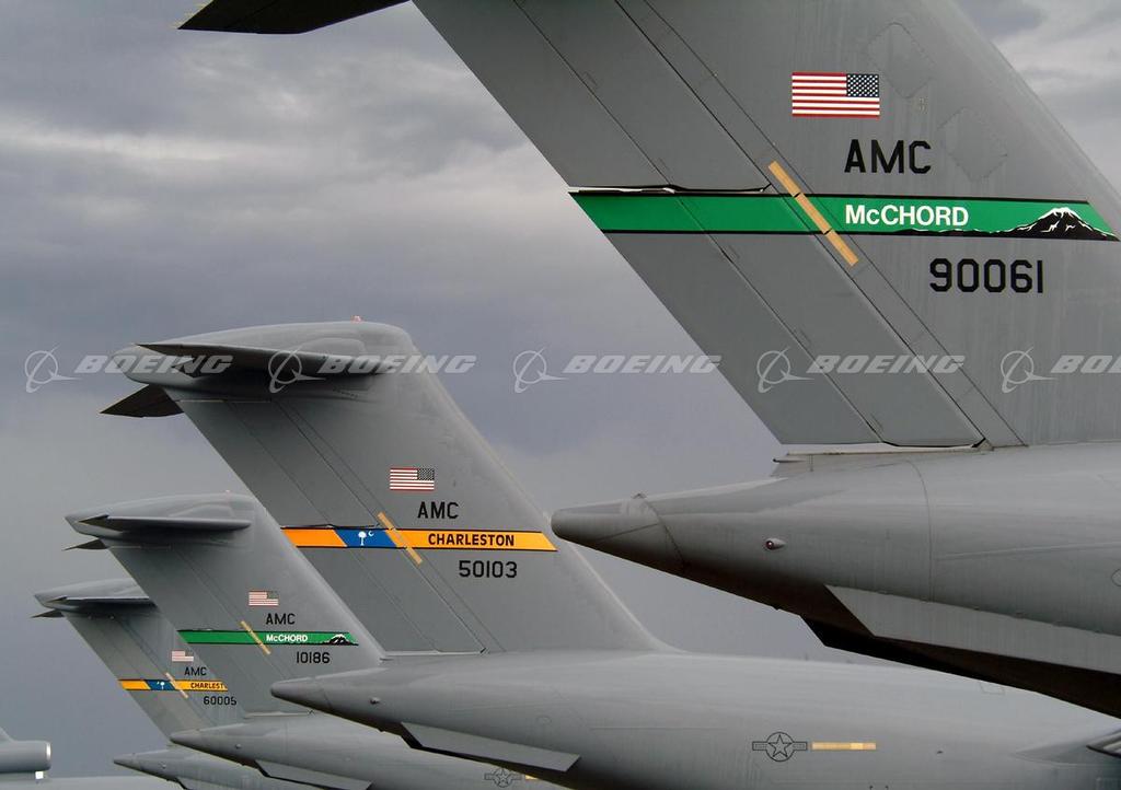 Tails of Multiple C-17 Globemaster IIIs in Flight Line
