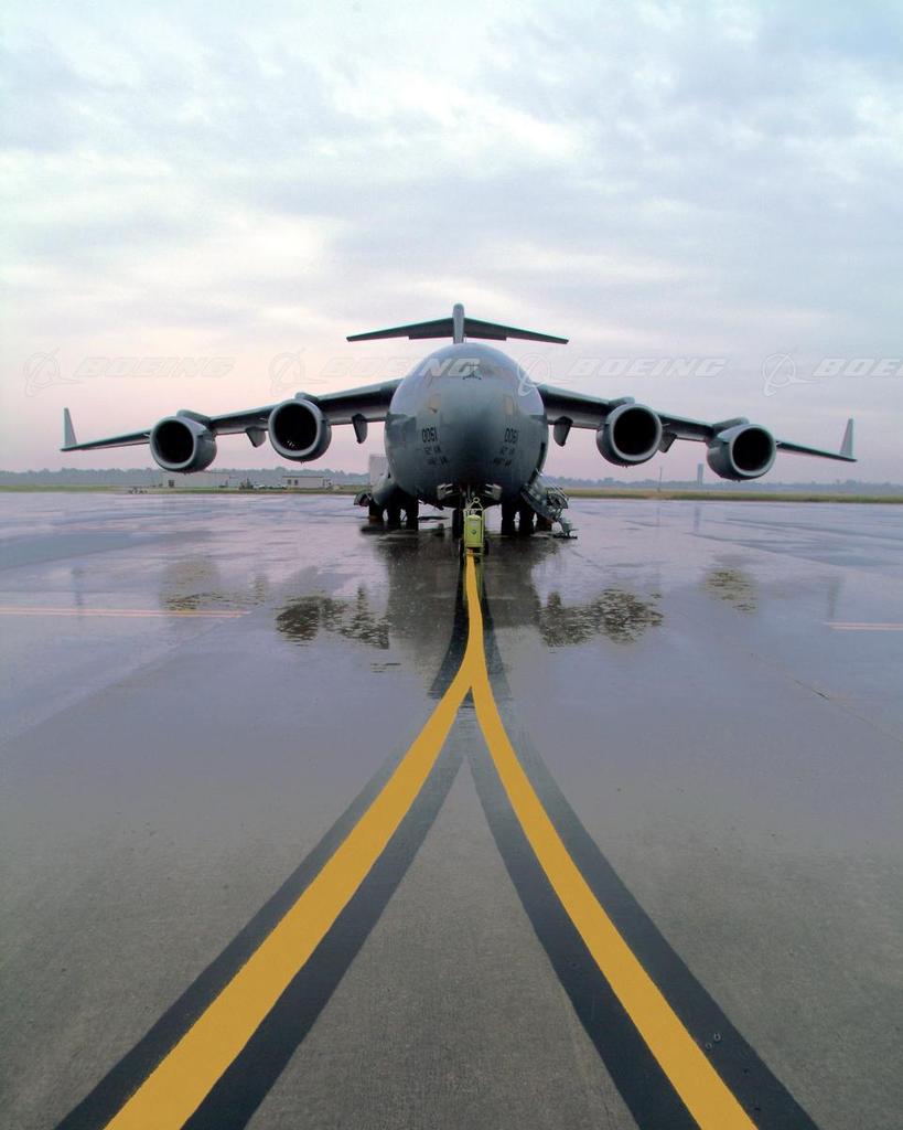 The C-17 Globemaster III is a high-wing, four-engine, T-tailed aircraft with a rear loading ramp. With its 160,000-pound payload, the C-17 can take off from a 7,600-foot airfield, fly 2,400 nautical miles and land on a small, austere airfield in 3,000 feet or less. On the ground, a fully loaded aircraft, using engine reversers, can back up a 2 percent slope. During normal testing, C-17s set 22 world records, including payload to altitude time-to-climb and the short takeoff and landing mark, in which the C-17 took off in less than 1,400 feet, carried a payload of 44,000 pounds to altitude and landed in less than 1,400 feet. Deployed in June 1993, it won the Collier Trophy in 1994, symbolizing the top aeronautical achievement of 1994.