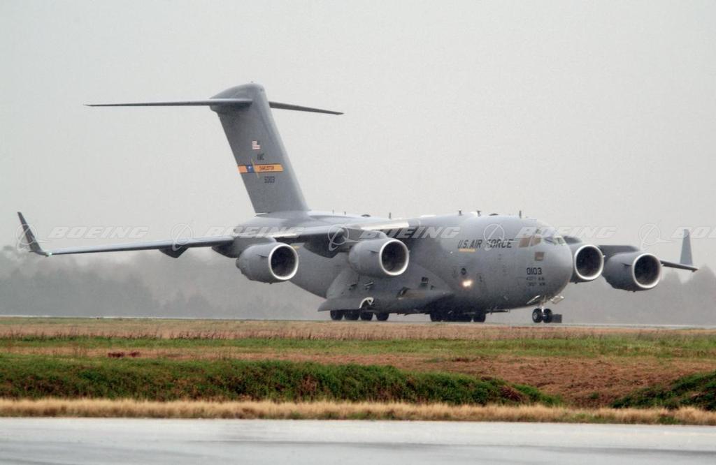 The C-17 Globemaster III is a high-wing, four-engine, T-tailed aircraft with a rear loading ramp. With its 160,000-pound payload, the C-17 can take off from a 7,600-foot airfield, fly 2,400 nautical miles and land on a small, austere airfield in 3,000 feet or less. On the ground, a fully loaded aircraft, using engine reversers, can back up a 2 percent slope. During normal testing, C-17s set 22 world records, including payload to altitude time-to-climb and the short takeoff and landing mark, in which the C-17 took off in less than 1,400 feet, carried a payload of 44,000 pounds to altitude and landed in less than 1,400 feet. Deployed in June 1993, it won the Collier Trophy in 1994, symbolizing the top aeronautical achievement of 1994.