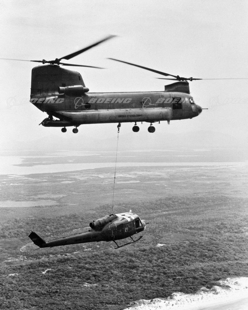 CH-47A Chinook Helicopter Transports Damaged Huey