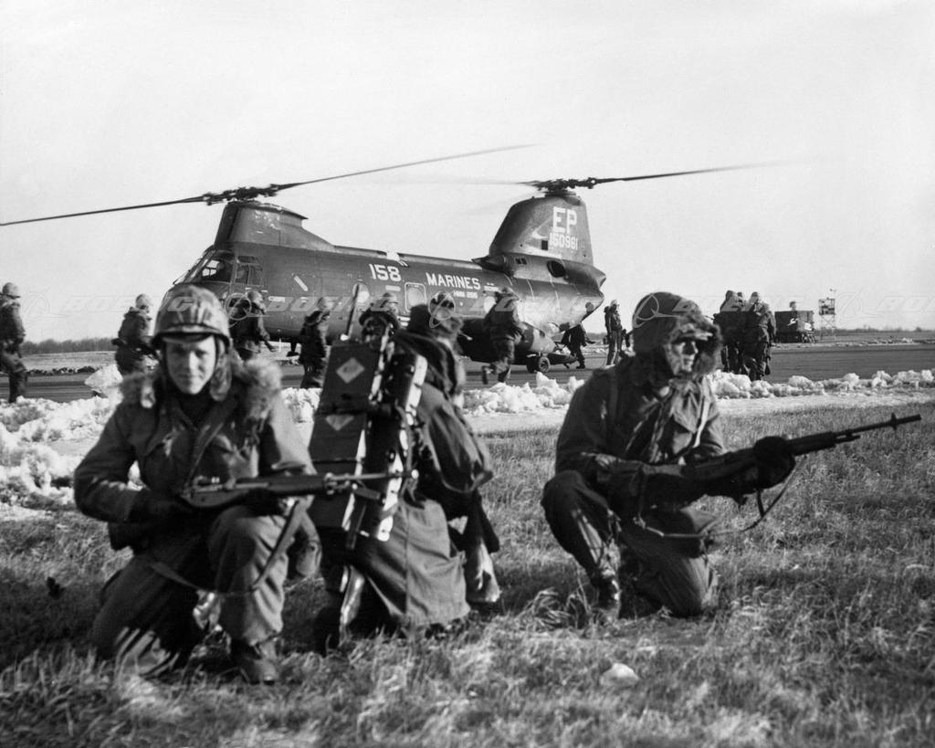 Marines with CH-46A Sea Knight Helicopter