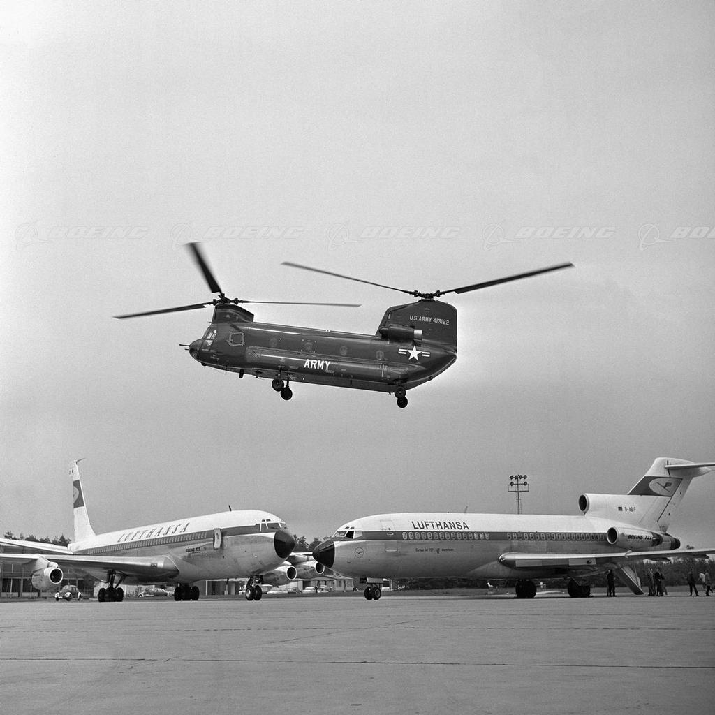 BOEING'S KISSING COUSINS Two Boeing commercial jetliners and Boeing Vertol's CH-47A Chinook helicopter got together for a reunion in Germany in 1965. The U.S. Army Chinook, was making its first public demonstration in Germany. The helicopter participated in the Paris Air Show, then later returned to Germany for a series of demonstrations at U.S. Army and German Army installations. This meeting of three members of Boeing's "aircraft family" was at Lufthansa's Frankfurt maintenance base. Three hundred persons, including press, witnessed the Frankfurt demonstration during which the Chinook performed high speed vertical climbs, flybys and hovered above Boeing 707 and 727 models of Lufthansa's fleet.