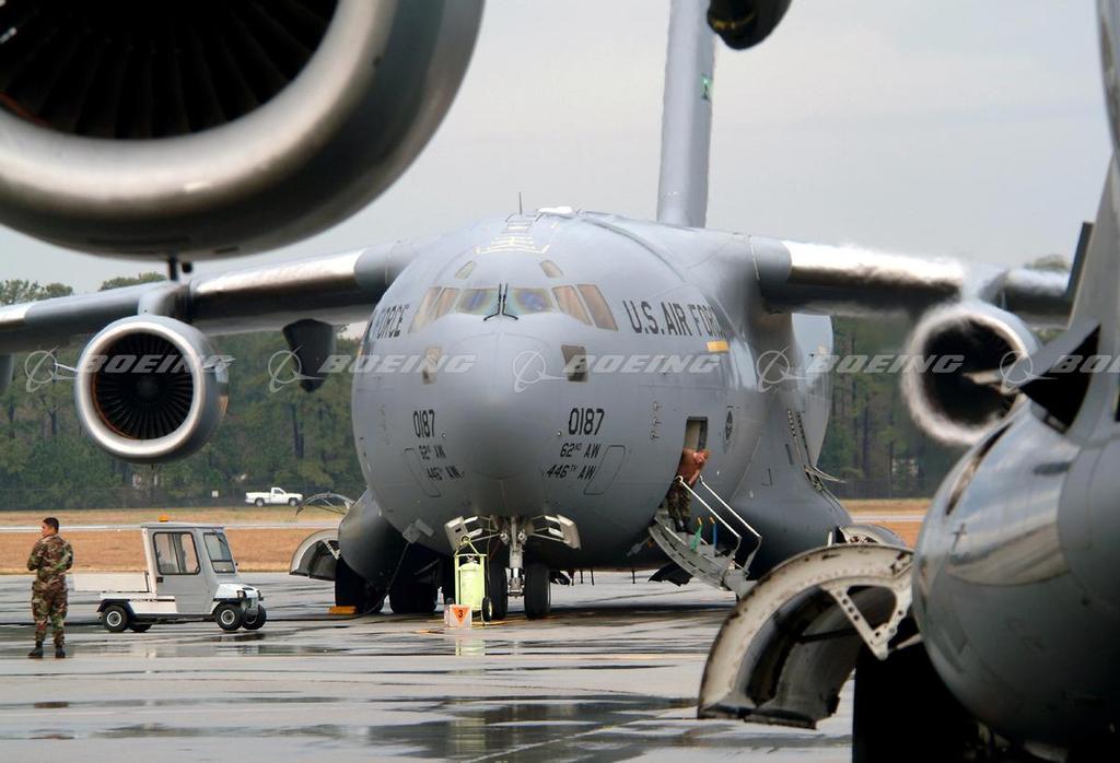 The C-17 Globemaster III is a high-wing, four-engine, T-tailed aircraft with a rear loading ramp. With its 160,000-pound payload, the C-17 can take off from a 7,600-foot airfield, fly 2,400 nautical miles and land on a small, austere airfield in 3,000 feet or less. On the ground, a fully loaded aircraft, using engine reversers, can back up a 2 percent slope. During normal testing, C-17s set 22 world records, including payload to altitude time-to-climb and the short takeoff and landing mark, in which the C-17 took off in less than 1,400 feet, carried a payload of 44,000 pounds to altitude and landed in less than 1,400 feet. Deployed in June 1993, it won the Collier Trophy in 1994, symbolizing the top aeronautical achievement of 1994.