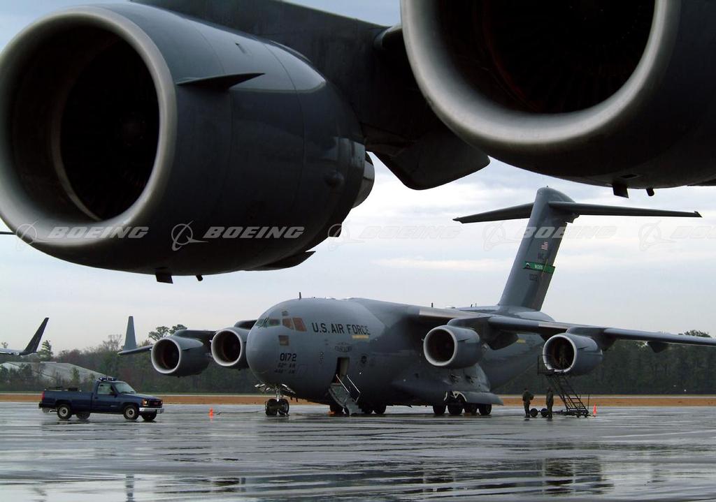 The C-17 Globemaster III is a high-wing, four-engine, T-tailed aircraft with a rear loading ramp. With its 160,000-pound payload, the C-17 can take off from a 7,600-foot airfield, fly 2,400 nautical miles and land on a small, austere airfield in 3,000 feet or less. On the ground, a fully loaded aircraft, using engine reversers, can back up a 2 percent slope. During normal testing, C-17s set 22 world records, including payload to altitude time-to-climb and the short takeoff and landing mark, in which the C-17 took off in less than 1,400 feet, carried a payload of 44,000 pounds to altitude and landed in less than 1,400 feet. Deployed in June 1993, it won the Collier Trophy in 1994, symbolizing the top aeronautical achievement of 1994.