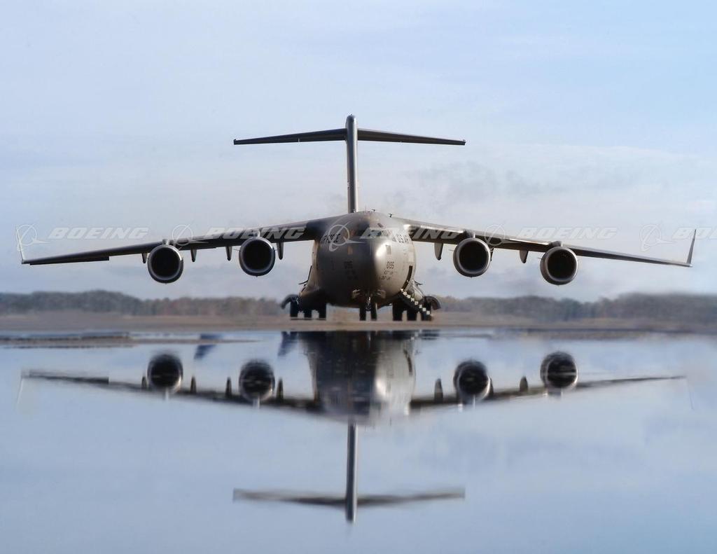 C-17 Globemaster III Mirror Image Reflected in Wet Tarmac