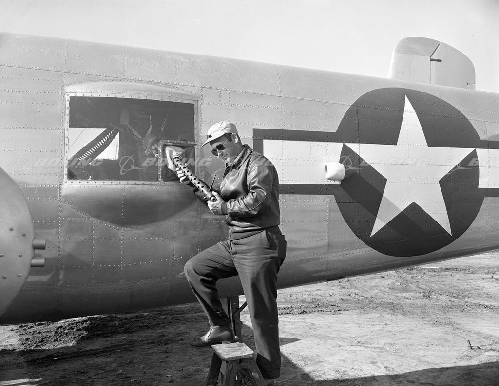 Man with B-25H Mitchell .50 Caliber Waist Gun