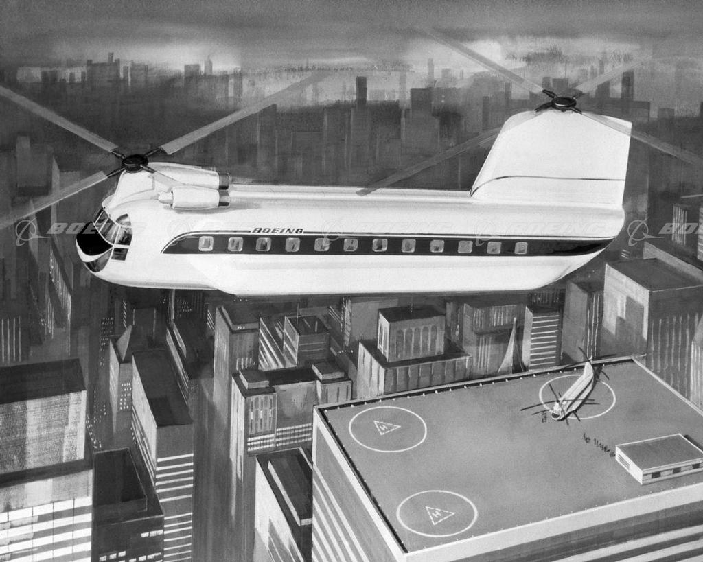 In the 1960s, Boeing's Vertol Division released advanced designs of two helicopters then being studied for inter city and airport to center city transportation. A major feature of the two new helicopters, according to Boeing engineers, was that operating costs per seat mile were to be about half that of helicopters then in service. The model 167 (shown here) differed from Boeing helicopters of the time, in that the engines were mounted on the forward, rather than the aft pylon. With a gross weith of 50,600 pounds, the 167 was to carry up to 72 passengers at a cruise speed of 185 mph. Powered by three Lycoming T55-1-11 engines, it was scheduled to be available in 1969.