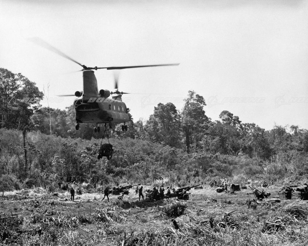 CH-47A Chinook Helicopter Transports Damaged Huey