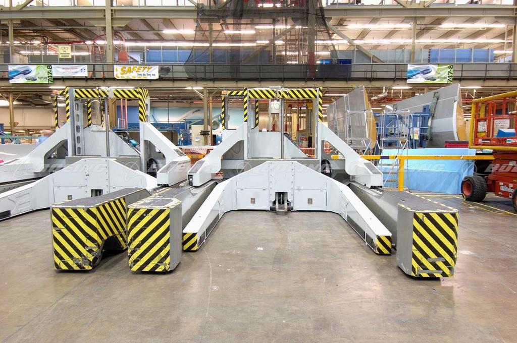 The 787 production system was designed using Lean manufacturing techniques in a simplified final assembly process. Portable tools, designed with ergonomics in mind, move the assemblies into place. No overhead cranes are used to move airplane structure.