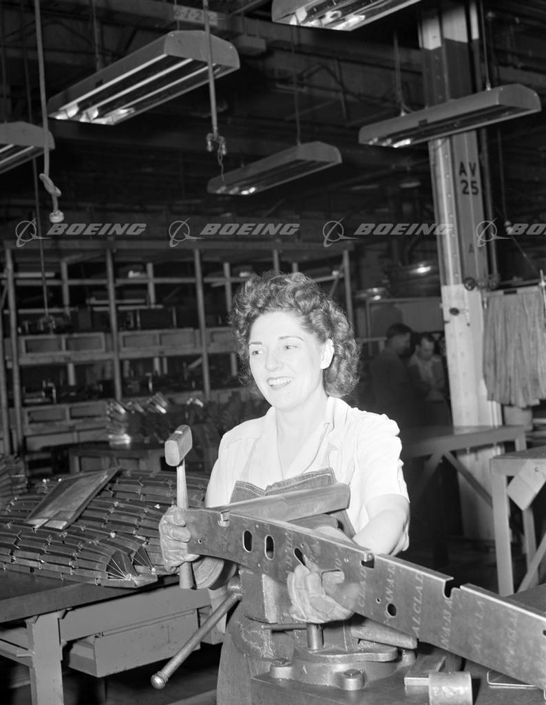At first, women worked only in the small handwork departments at NAA's Kansas division. Then gradually they were assigned to the pattern shop, the final assembly line, welding, punch-pressing, and other production departments. By the end of WWII, more than 40 percent of NAA's Kansas division were women, working in almost every department.