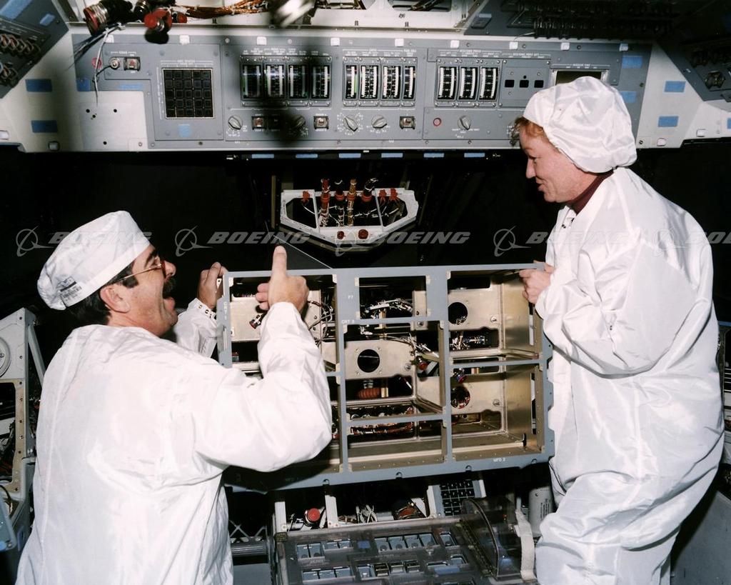 Boeing employees Robert Moore (left) and Lorelee Anderson (right) help install the framework to house the Multifunction Electronic Display Subsystem (MEDS) in the cockpit of the Space Shuttle Atlantis at the Boeing facility in Palmdale, CA.