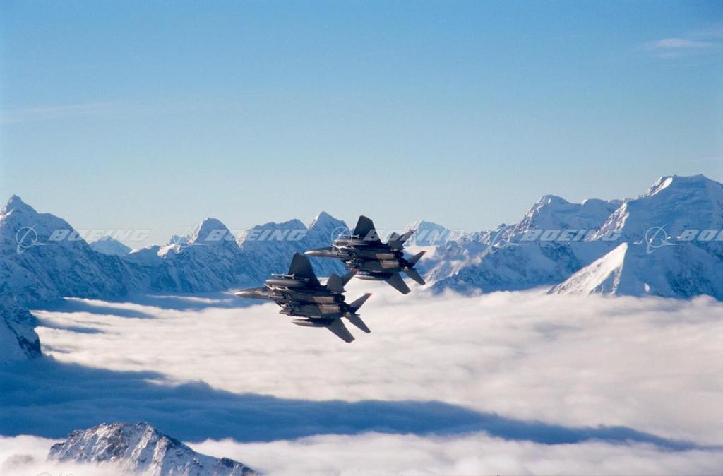 Twin F-15E Strike Eagles in Flight over the Alaskan Wilderness