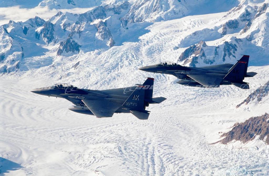 Twin F-15E Strike Eagles in Flight over the Alaskan Wilderness