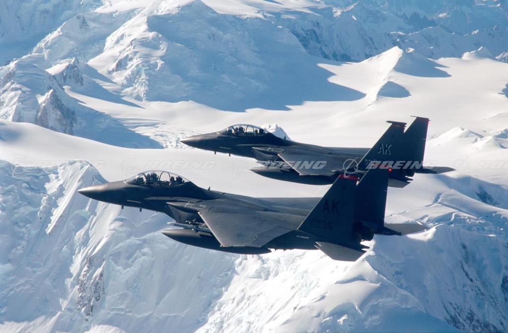 Twin F-15E Strike Eagles in Flight over the Alaskan Wilderness