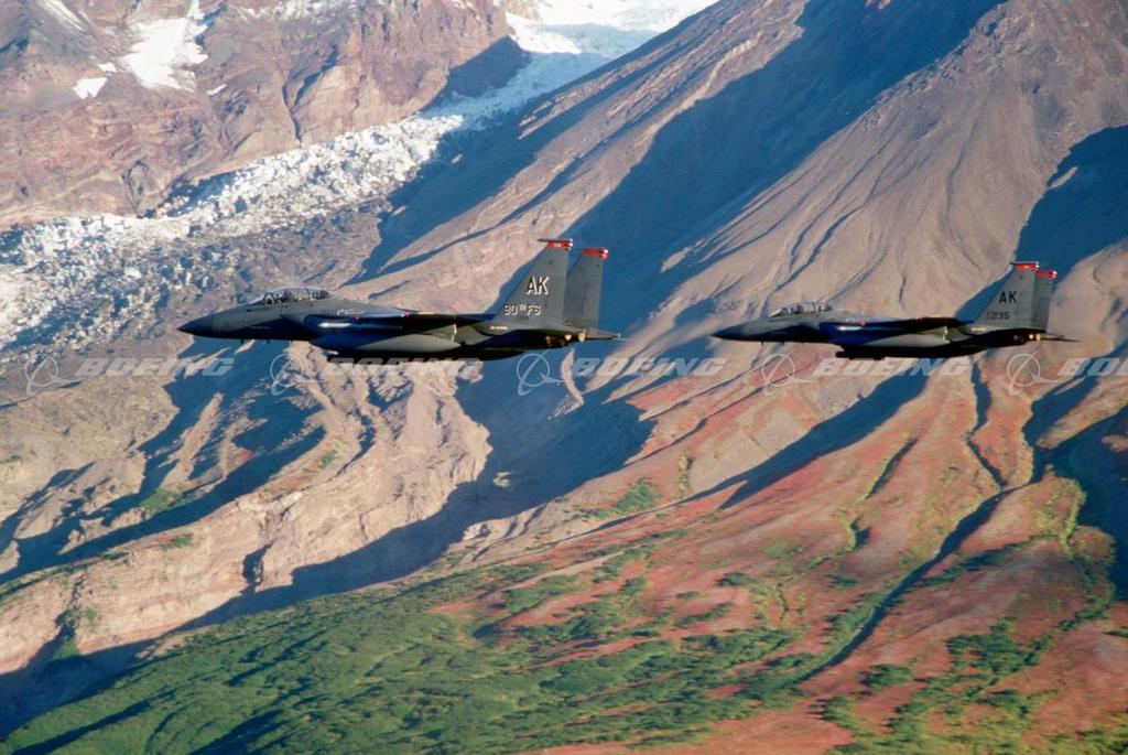 Twin F-15E Strike Eagles in Flight over the Alaskan Wilderness